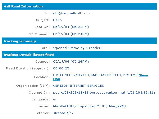 This is the approximate location of the recipient based upon the IP Address of their computer at the time they read the message. This is only an appoximate location. If you would like to receive more accurate location information from the most accurate data source, this is available in the Additional Services section of your account. Click here for more information.